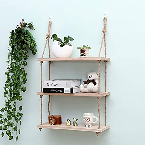 HJW Praktische opbergrek Punch-Free drijvende plank opknoping rek, houten wandhouder opbergstandaard voor fotolijst boek plant pot henneptouw decoratieve wandplank 1Huiyang-01020,3 tier