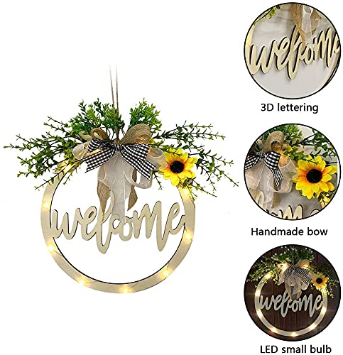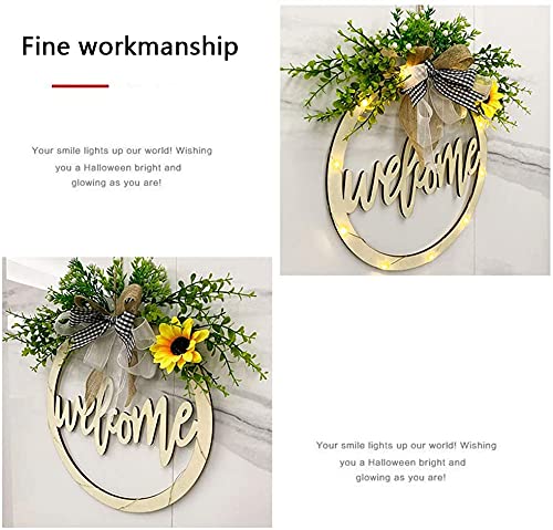 Welkom teken voor voordeur, zonnebloemkransen met kunstmatige plant lint boog, houten holle gesneden outdoor veranda decor daisy welkomstkransen met LED-licht voor thuis tuin bruiloft kerstfeest